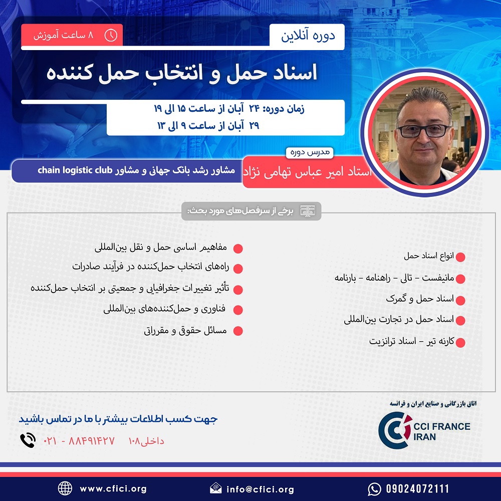 اتاق مشترک بازرگانی ایران و فرانسه در نظر دارد وبینار آموزشی 8 ساعته «اسناد حمل و انتخاب حملکننده» را روزهای 24 و 29 آبانماه از ساعت 15 الی 19 و 9 الی 13 برگزار کند.