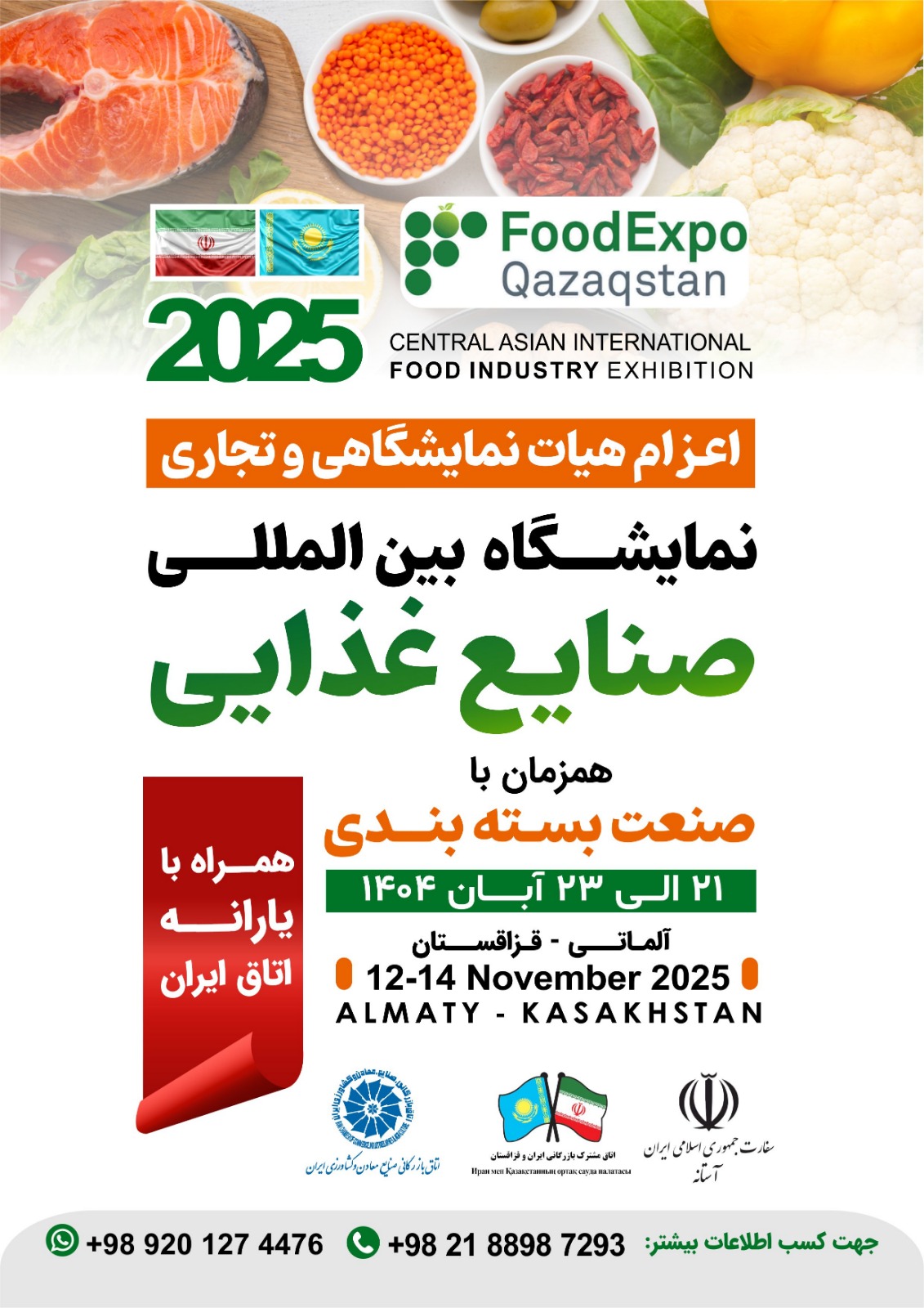 اتاق مشترک بازرگانی ایران و قزاقستان در نظر دارد با حمایت مالی اتاق ایران، هیأتی متشکل از فعالان اقتصادی و مدیران شرکتهای منتخب را همزمان با برگزاری نمایشگاه بینالمللی صنایع غذایی Food Expo Kazakhstan آلماتی در تاریخ ۲۱ لغایت ۲۳ آبانماه سال جاری به کشور قزاقستان اعزام کند.