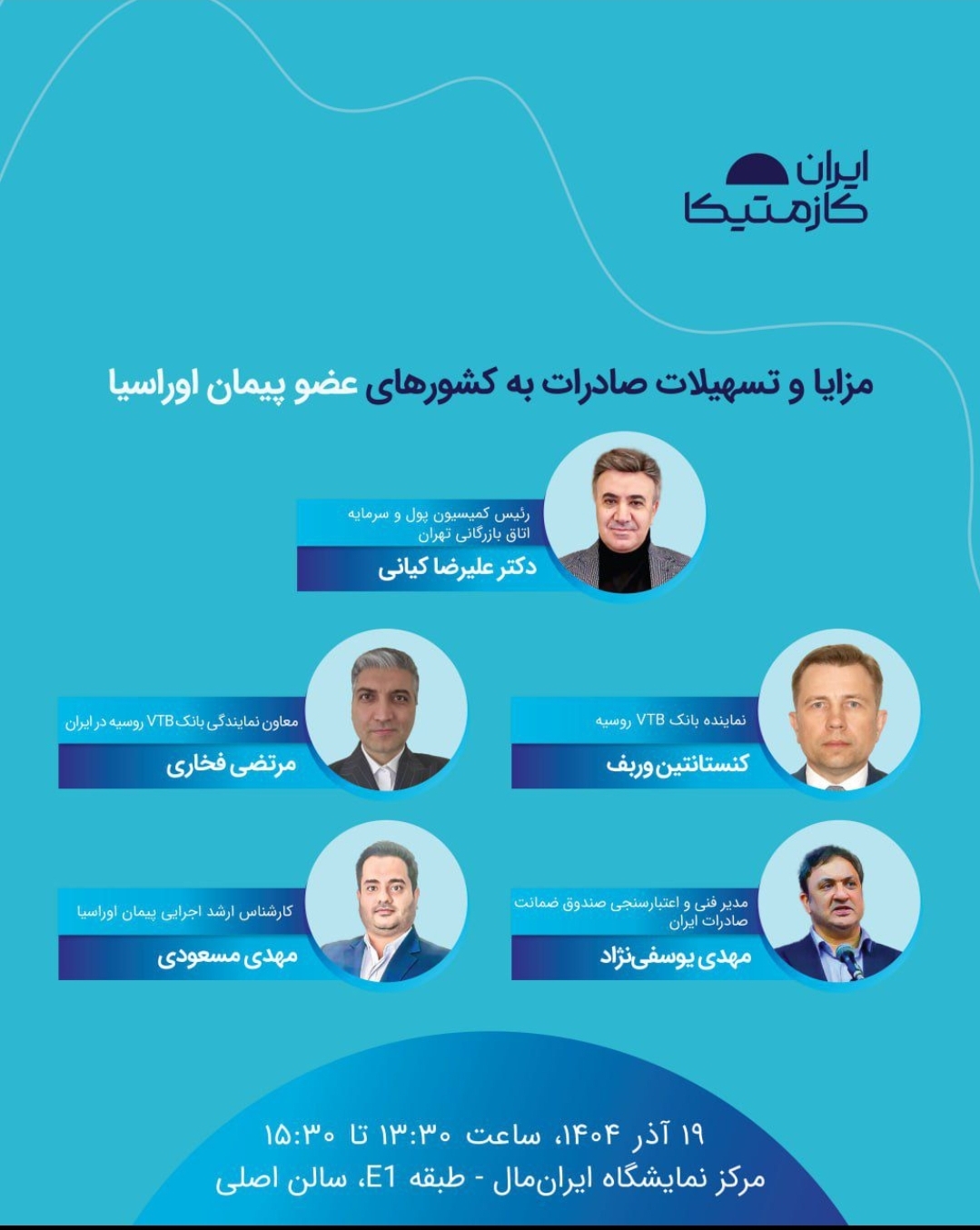 این نشست با حضور کنستانتین وربف نماینده بانک VTB روسیه، مهدی مسعودی کارشناس ارشد اجرایی پیمان اوراسیا، مرتضی فخاری معاون نمایندگی بانک VTB روسیه در ایران و مهدی یوسفی مدیر فنی و اعتبارسنجی صندوق ضمانت صادرات ایران ۱۹ آذرماه در مرکز نمایشگاهی ایران‌مال برگزار می‌شود.